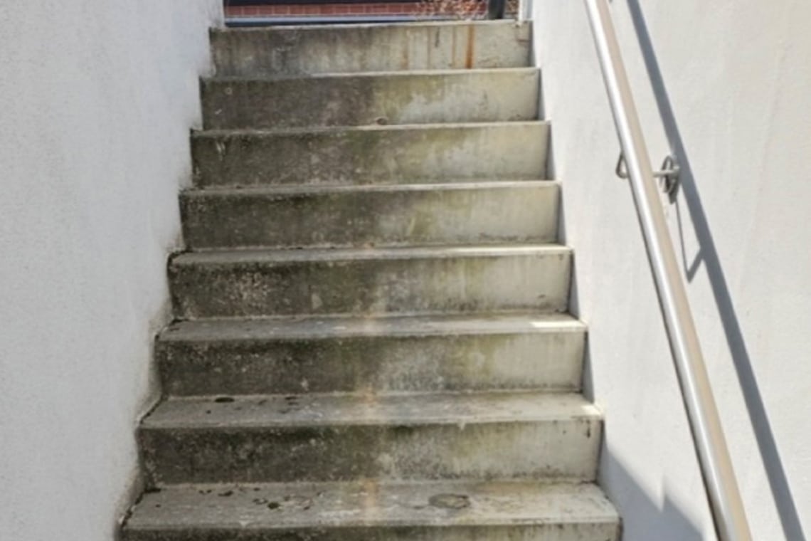 Reinigung einer Betontreppe zur Untergrundvorbereitung inklusive Ausbesserung und Farbanstrich für den langfristigen Werterhalt