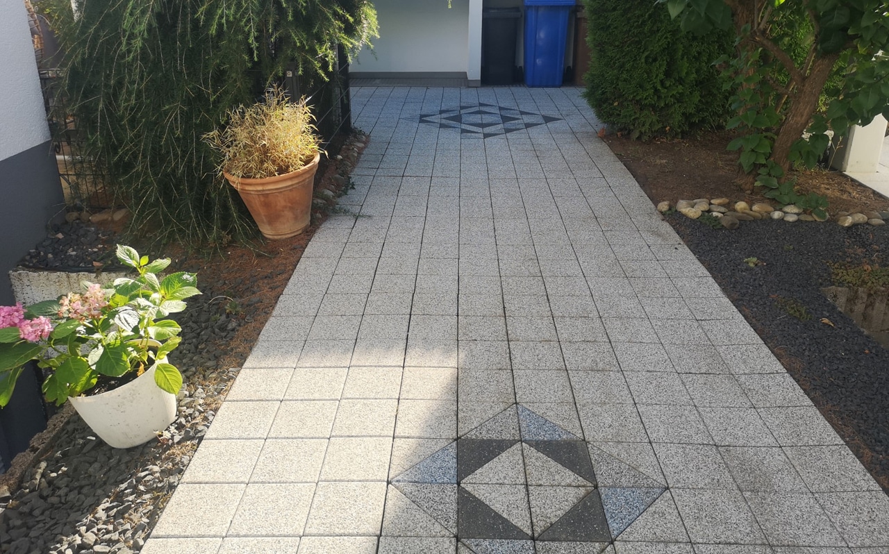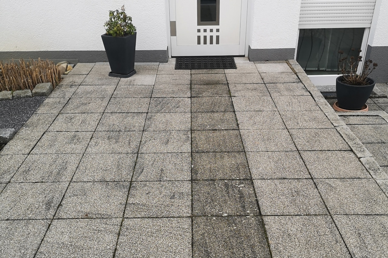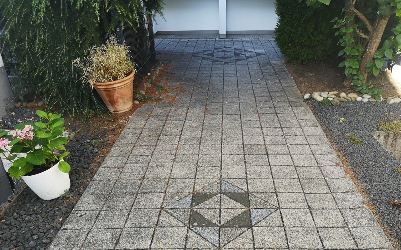 Reinigung von Pflastersteinplatten an einem Einfamilienhaus